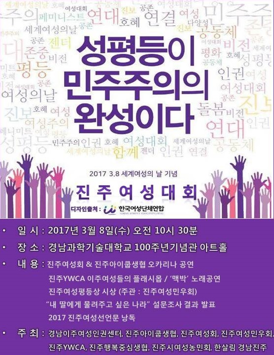 3¿ù 8ÀÏ ¼¼°è¿©¼ºÀdz¯À» ¸ÂÀÌÇÏ¿© 2017³â 3¿ù 8ÀÏ ¿ÀÀü 10½Ã 30ºÐ, °ú±â´ë 100Áֳ⠱â³ä°ü ¾ÆÆ®È¦¿¡¼ ÁøÁÖ¿©¼ºÈ¸´ëȸ°¡ ÁøÇàµË´Ï´Ù. ¸¹Àº Âü¿©¹Ù·¡¿ä^^