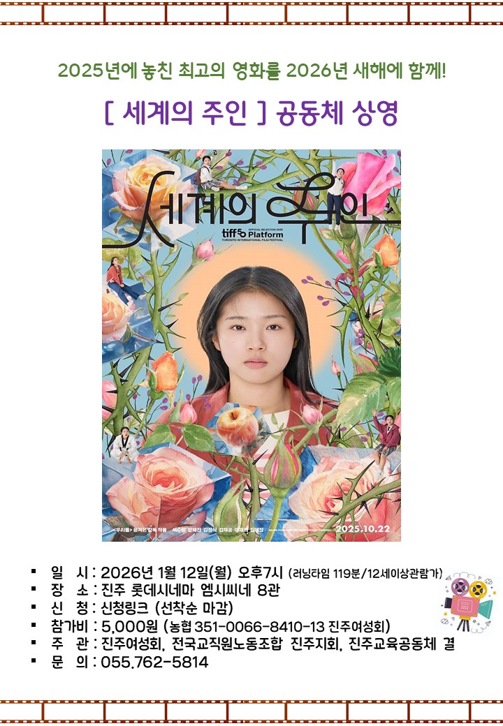 ¡Ý ÀÏ ½Ã : 2026³â 1¿ù 12ÀÏ(¿ù) ¿ÀÈÄ7½Ã (·¯´×ŸÀÓ 119ºÐ/12¼¼ÀÌ»ó°ü¶÷°¡) ¡Ý Àå ¼Ò : ÁøÁÖ ¿¥½Ã¾¾³× 8°ü ¡Ý ½Å û : ½Åû Æû (¼±Âø¼ø ¸¶°¨) ¡Ý Âü°¡ºñ : 5,000¿ø (³óÇù 351-0066-8410-13 ÁøÁÖ¿©¼ºÈ¸) ¡Ý ÁÖ °ü : ÁøÁÖ¿©¼ºÈ¸, Àü±³Á¶ ÁøÁÖÁöȸ, ±³À°°øµ¿Ã¼ °á ¡Ý ¹® ÀÇ : ÁøÁÖ¿©¼ºÈ¸ 055.762-5814